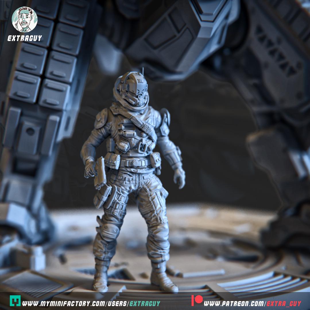 Includes a detailed Militia Pilot and a custom mech base